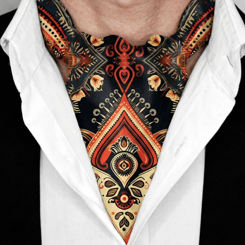 The Genuine Silk Winter Mandala Ascot Cravat is a bold, intricate accessory that celebrates heritage patterns and cold-season richness. With deep crimson reds, golden ochres, and charcoal black forming a dramatic, symmetrical mandala motif, this ascot carries an unmistakable sense of warmth, tradition, and artistry.