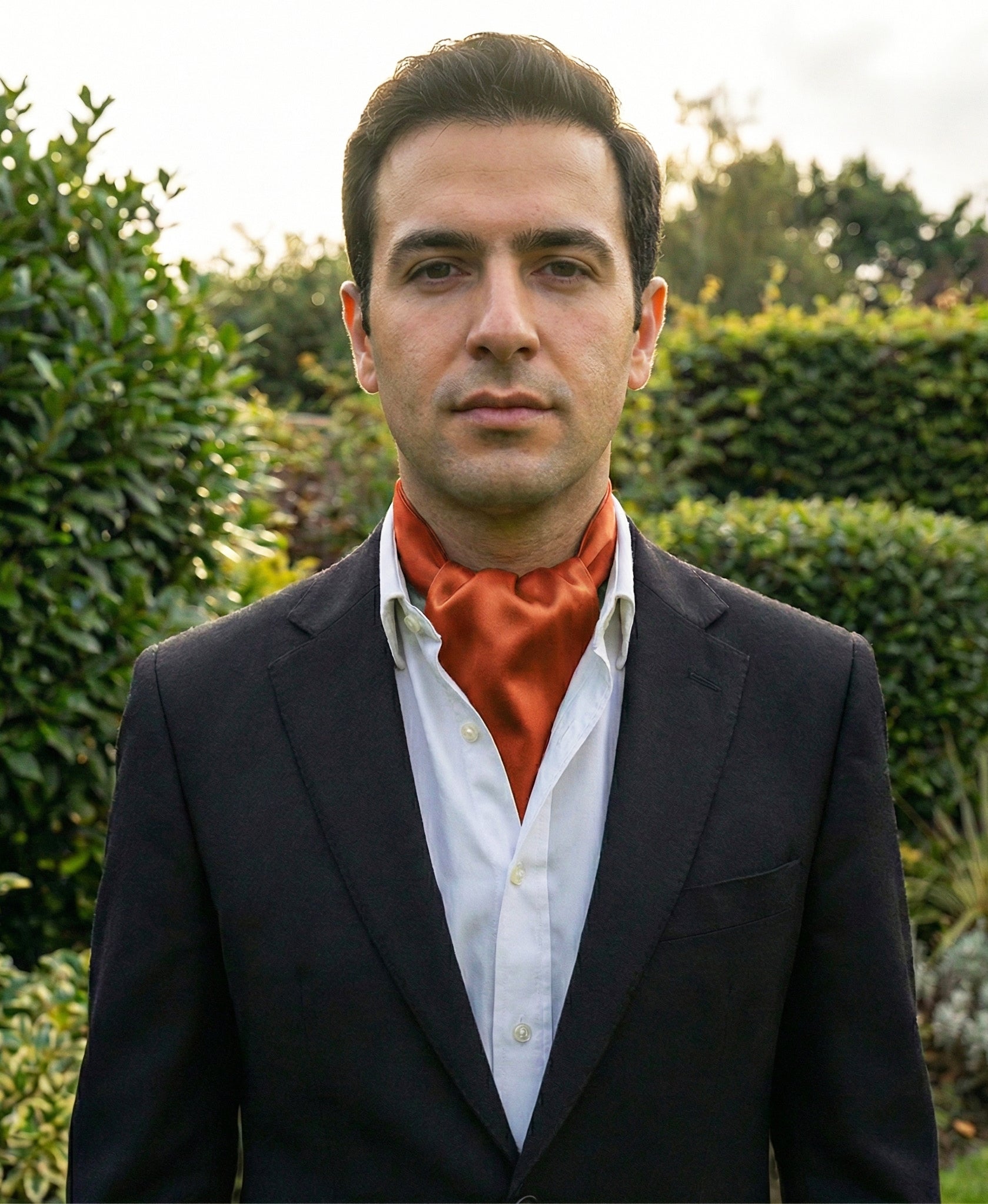 Adding an ascot cravat can transform a standard suit or tuxedo, highlighting your meticulous attention to detail and appreciation for classic style. Burnt orange is extremely versatile, complementing a range of suit colours from traditional black and navy to lighter tones like grey or beige. The solid pattern introduces a layer of visual interest, ensuring your ensemble stands out in a crowd of conventional ties and bowties.