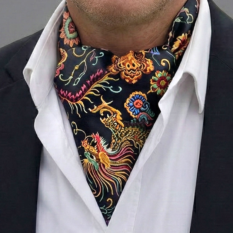 This bold silk ascot features a striking traditional Chinese dragon motif, intricately woven in gold against a deep black background. The mythical creature, detailed with flowing whiskers, sharp claws, and an undulating body, symbolises power, wisdom, and prosperity. Surrounding floral patterns and swirling cloud motifs enhance the richness of the design, giving it an imperial quality reminiscent of ancient Chinese textiles. The luxurious silk fabric provides a smooth, refined finish with a subtle sheen that elevates the artwork's depth. Ideal for those who appreciate cultural heritage and statement accessories, this ascot adds a touch of mystique and grandeur to any ensemble. Whether worn at formal occasions or styled for a distinctive aesthetic, this ascot is a masterpiece of tradition and sophistication.